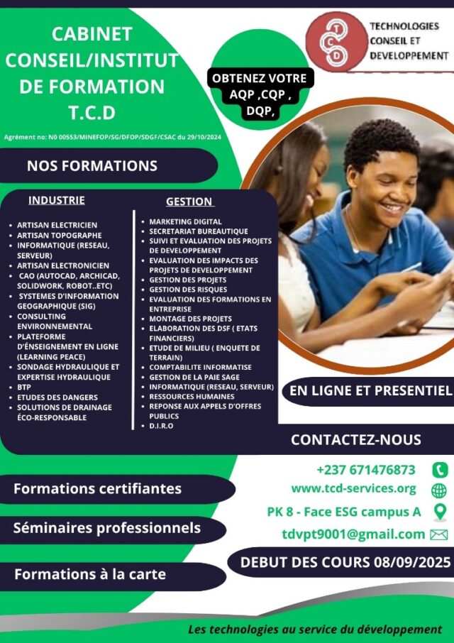 Technologies Conseils en Développement est un institut de formation professionnelle agréé par arrêté ministériel n°00553/MINEFOP/SG/DFOP/SDGSF/CSACD/CBAC du 29/10/2024.